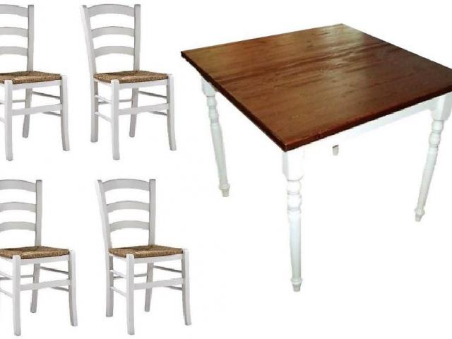 Produciamo e rivendiamo direttamente, senza intermediari, a prezzo di fabbrica set completi composti da sedie e tavoli per bar e ristorante. Direttamente dal produttore al ristoratore Set completo composto da: Un tavolo con gamba tornita in legno di faggio massello color anilina bianca. Piano in legno di pino massello 80x80 con spessore da 3 cm color noce. Quattro sedie Venezia in legno di faggio massello con seduta impagliata color bianco anilina. Set in stile shabby chic, country, adattabile a ogni tipo di ambiente. Ideale per arredare alberghi, ristoranti, pub, pizzerie, taverne, B&B, trattorie e bar.